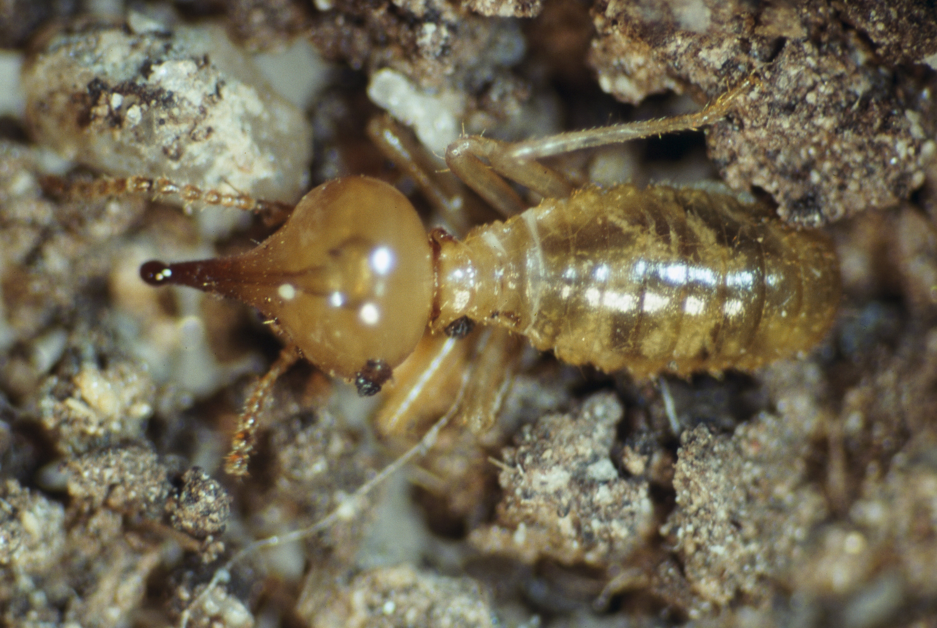 4. Nasutiform Termites (Nasutitermes spp.): Nasutiform termites are recognized by their distinctive soldier caste, which has a long, pointed head. They often build their nests in trees, stumps, and logs. While some species are considered pests due to their ability to damage timber, others play beneficial roles in decomposing dead plant material.